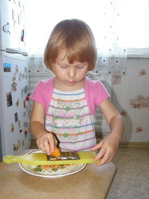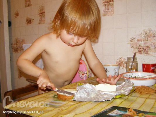 В течение недельки Лиза хорошо освоила технику приготовления бутербродов, причем в нем главное Масло))) и процесс работы с теркой.
