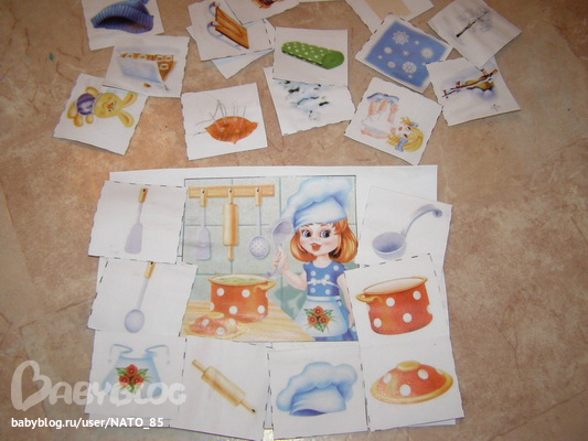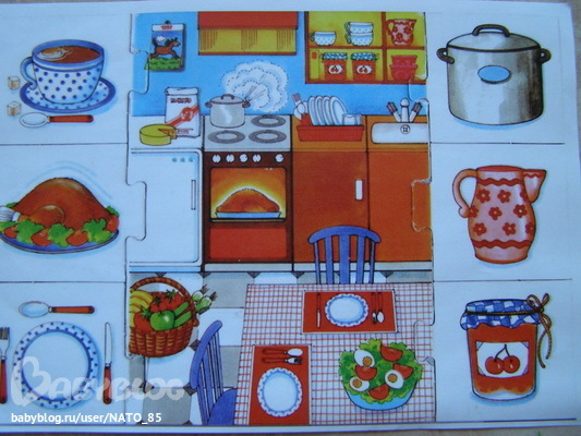 Нашла вот такую картинку-пазл, но мы ее использовали не как пазл, а как просто картинку. Искали нужную вещь и просто обсуждали, фантазировали придумывая все новые и новые рассказы.