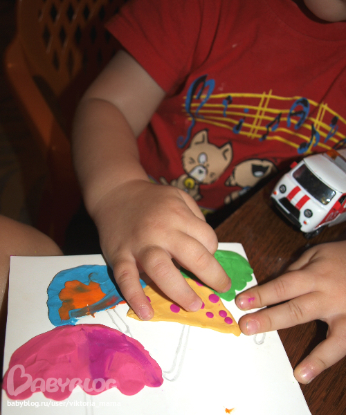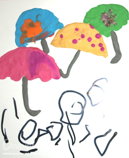 Еще сделали зонтики из пластилина и нарисовали маркером человечков=)