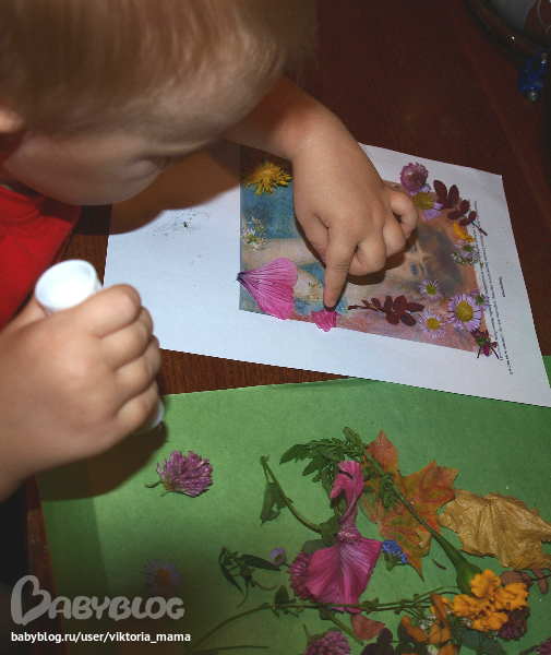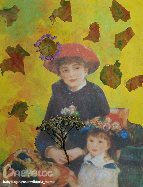 А вот наша картина "Две сестры" . Тим нарисовал осенний фон, а потом украсил картину листиками и цветочками.