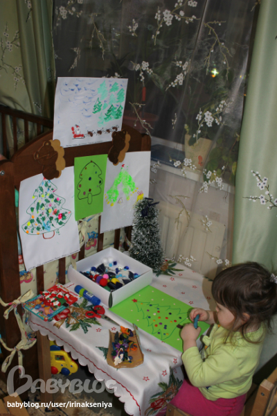 Еще одну елочку украсили камнями на липучках и решили повесить картинки над столиком, получилось как-то так)