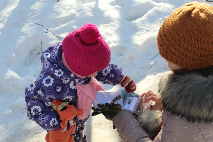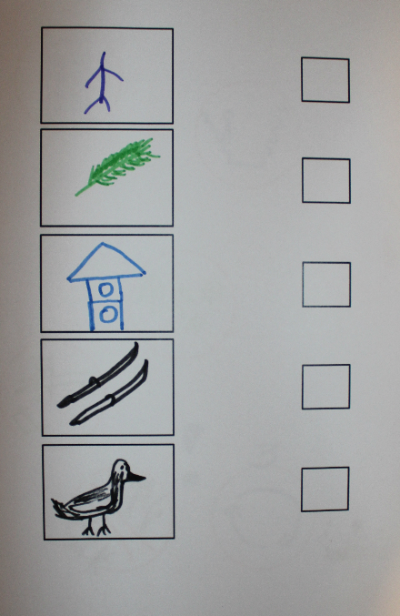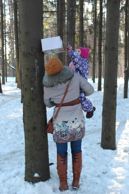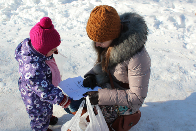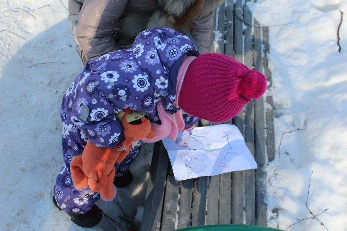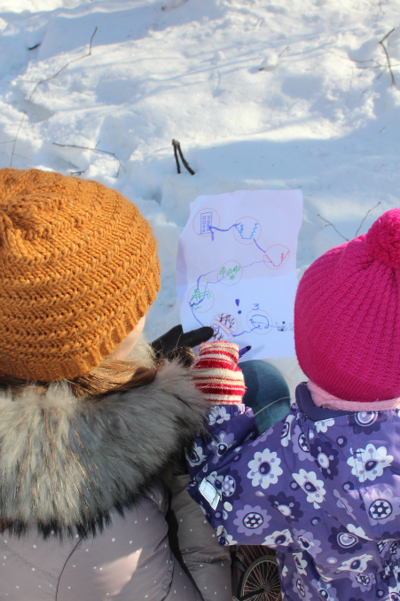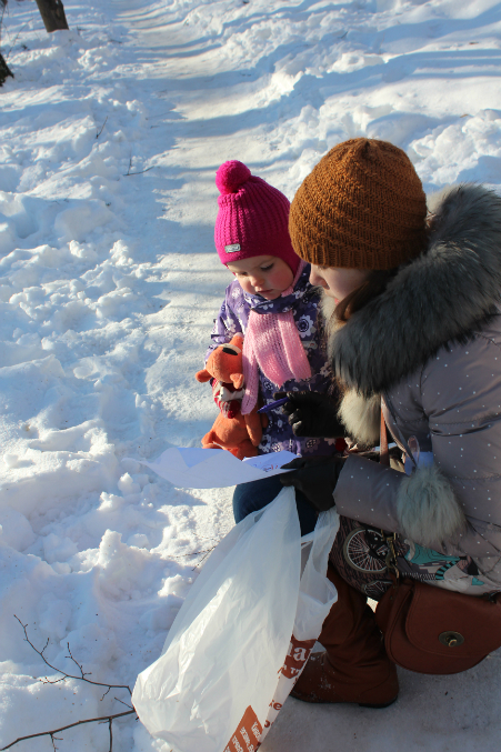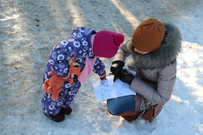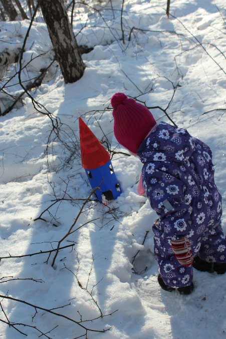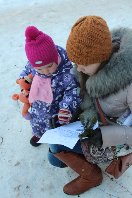 Помимо следования по карте нам нужно было отыскать палку-человеткина, еловую веточку, кормушку, лыжи, ворону.