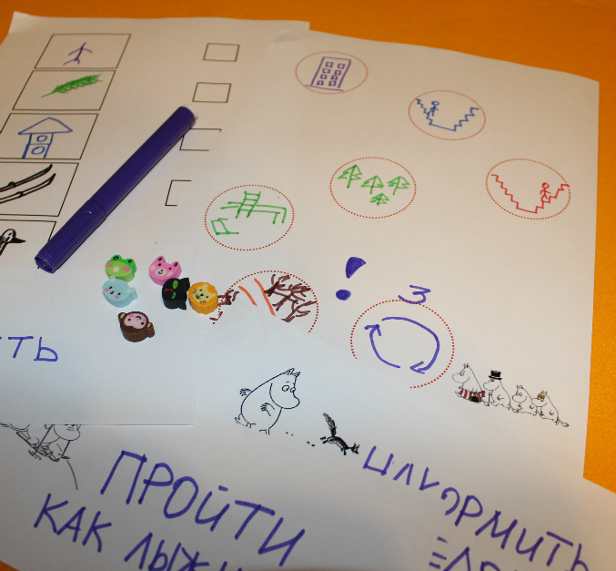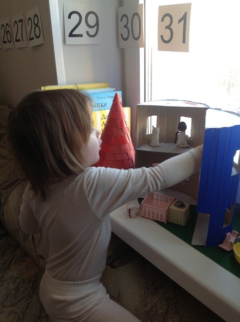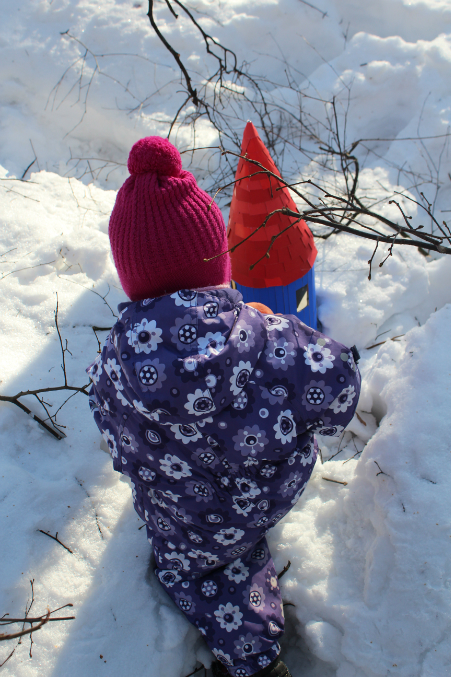 И опля! Мы видим дом!!!!!! )Расскажу, как там образовался дом - пока Алиса мчалась вперед, я свернула направо )) А на Алисика тем временем свались еще одно задание - пройтись как лыжник, а перед этим еще нужно было спеть. В общем, пока они с папой занимались всем этим, я поставила домик и муми-троллей и пришла к Алисе - мы провели конечный кусочек маршрута, а в далеке уже краснелась крыша муми-дома )