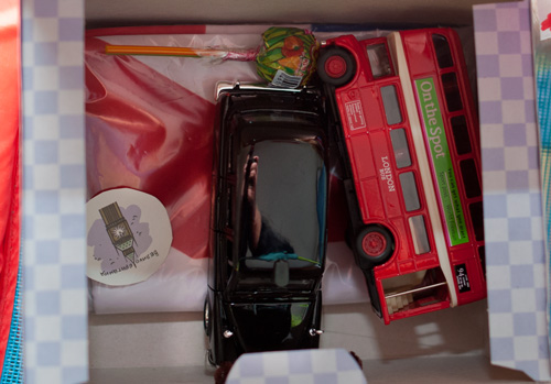 А что же было внутри чемодана? Конечно же подарки :))) (Флаг, модель такси и автобуса, наклейка, несколько фото достопремичательностей и конечно же любимый Сашей чупа чупс ) :)))