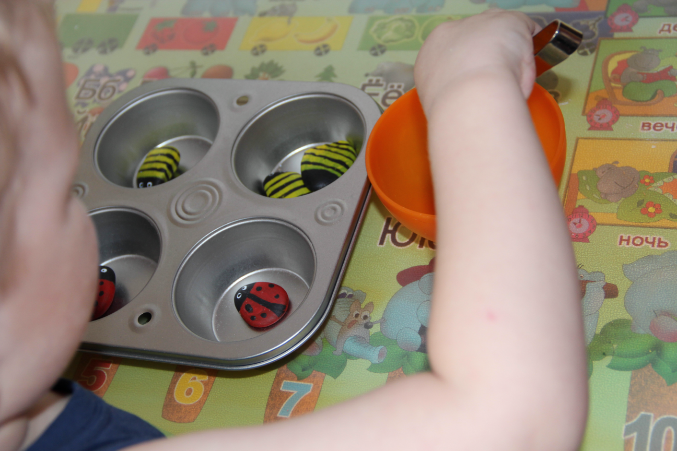 Еще одним заданием было рассортировать пчелок и божих коровок. Спонтанно получилось. Алешка увидел любимые щипцы и стал крутиться искать чтобы такое этими щипцами взять)))) А тут рядом лежали как раз приготовленные для игры наши пчелки и коровки)))