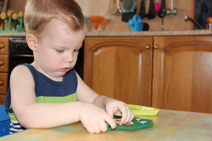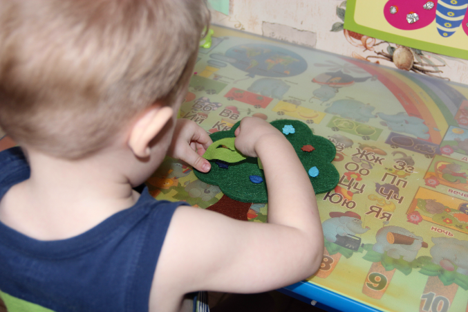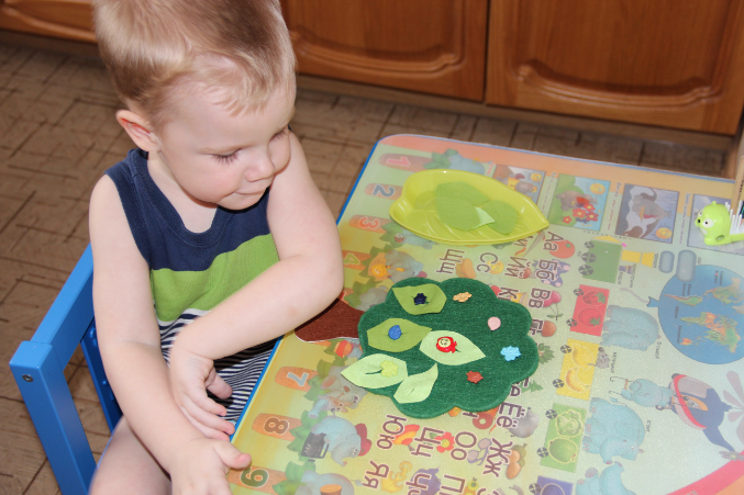 Вернемся к занятиям. Опять же наша поляна. Но на этот раз цветочки уже были готовы и ждали своих бабочек. Нужно было соотнести кол-во кружочков на крыльях бабочек с цифрой на цветочке. В принципе Алешка сообразил быстро, но хватило его не на долго. Не очень удобно такие прищепки цеплять. В смысле бабочки мешались.