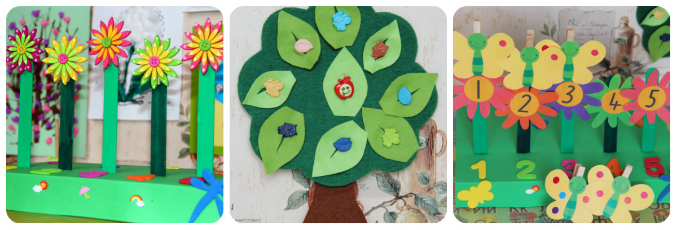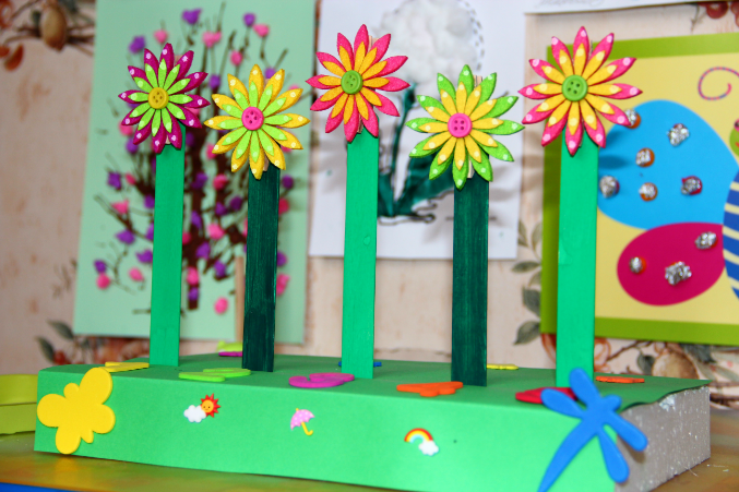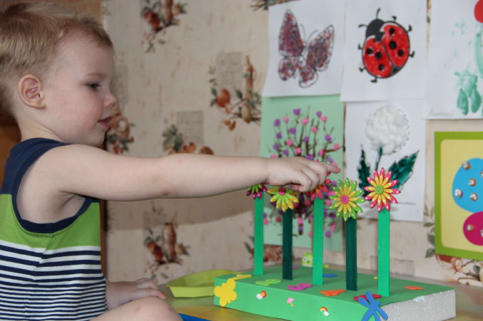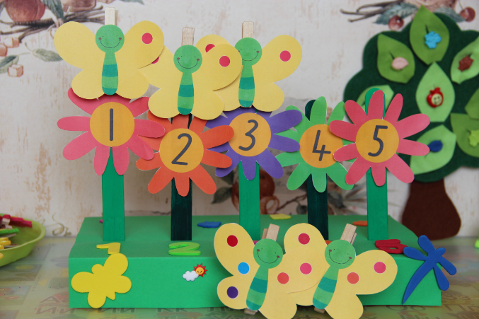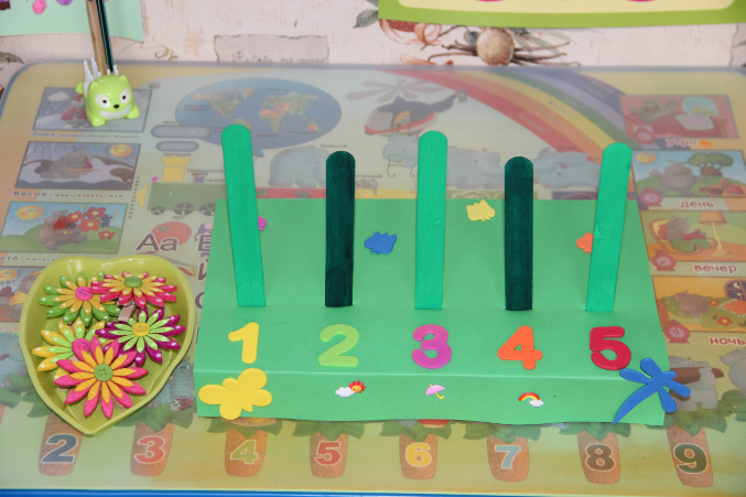 Появилась у нас вот такая полянка. Все просто. Кусок пенопласта обклеин цветной бумагой. Вставлены разукрашенные шпатели - это наши стебельки. Наклеины цифры от 1 до 5, ну и прочая атрибутика, типа бабочек, цветочков.