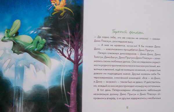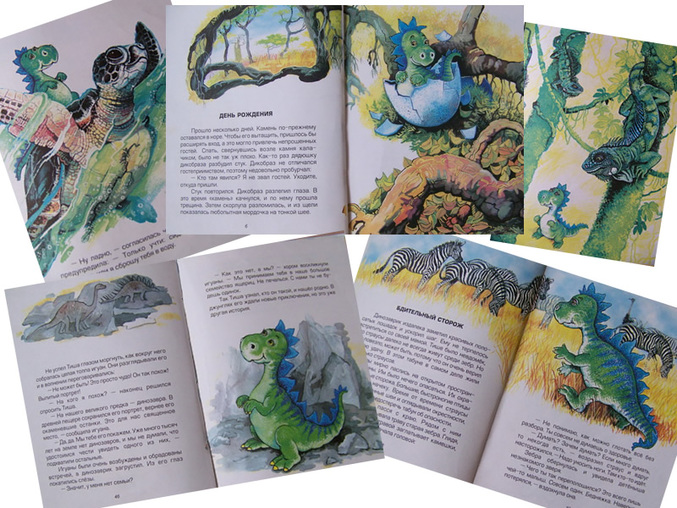 Честно скажу. что меня книга не впечатлила - сюжет примитивный, да и излагается не шедевриально, но при этом всем Лизе нравится. Она очень переживала за динозавриков и все время возмущалась - чтоб Тирранозавр уходил и их не трогал! Правда она сразу запротестовала против его книжного имени - Мясоед, так что у нас это как и положенно тирранозавр Рекс или просто Рекс, да и остальные имена мы читаем без Дино, просто Прыгут, Толстун...