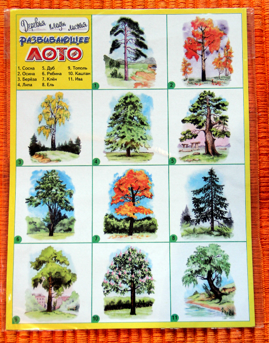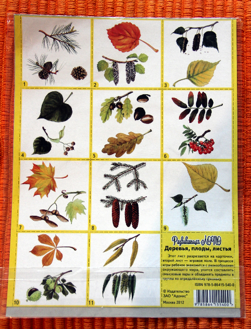 3. Лото "Деревья, плоды, листья". Тут более удобного размера карточки (весь лист - формата А4 примерно), а сам картон потоньше.