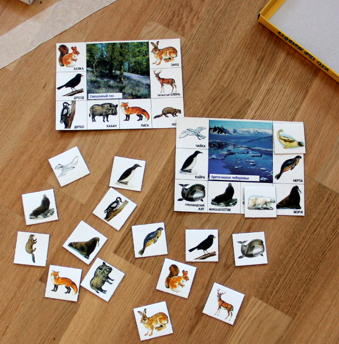 Натуралистичные и яркие картинки, плотный картон. Сыну для начала выдала две большие карточки, он очень увлёкся, хотя карточки маленькие и аккуратно класть их на место ему не так-то просто. (Есть другое издание этой игры с добавлением "мини", там карточки ещё меньше - мне кажется, это вообще должно быть неудобно, даже детям постарше). Когда игра совсем надоест, можно будет вырезать квадратики с животными с больших карточек, и получится отличное мемори на более старший возраст. Но, думаю, мы и в этом варианте ещё долго играть будем.