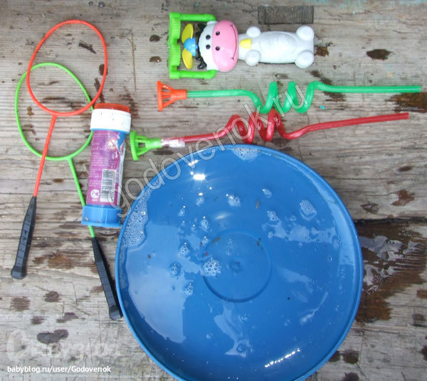 В набор входит емкость, которую еще можно использовать как летающую тарелку, обруч с держателем для пускания мыльных пузырей и две небольших упаковки с раствором.