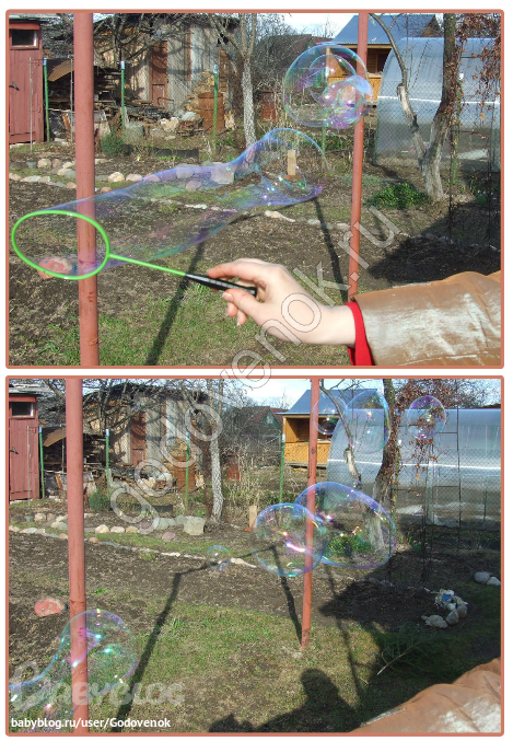 В отличие от гигантских пузырей эти пузыри под силу "выдувать" и ребенку. Пузыри получаются достаточно большие, их диаметр примерно 10-17 сантиметров. Эти пузыри тоже не надо дуть как обычные (маленькие), палочкой просто надо вести по воздуху.