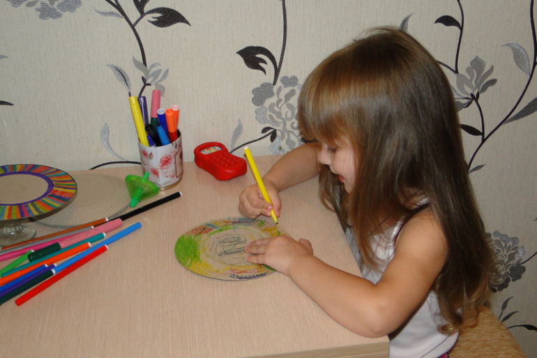 Понадобятся 2 бумажные одноразовые тарелки, карандаши/фломастеры и клей.Сначала раскрашиваем (у нас каждый свою тарелку))), серединку не трогаем, так как ее потом надо будет вырезать, вырезаем, складываем 2 тарелки и склеиваем края. Все!!!!) Можно развлекаться!