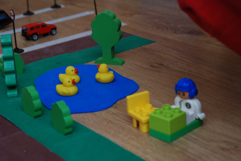 Тротуары из бархатной бумаги, газон из нее же и пруд из пенки появился сегодня ночью (все на двойной скотч, лучше брать бумагу и пенку самоклеящаюся). Эх, дорога пыльная уже какая-то, только на фото заметила, будем вызывать дворника или машину для уборки улиц. Рядом кафешка, пока недоработанная.