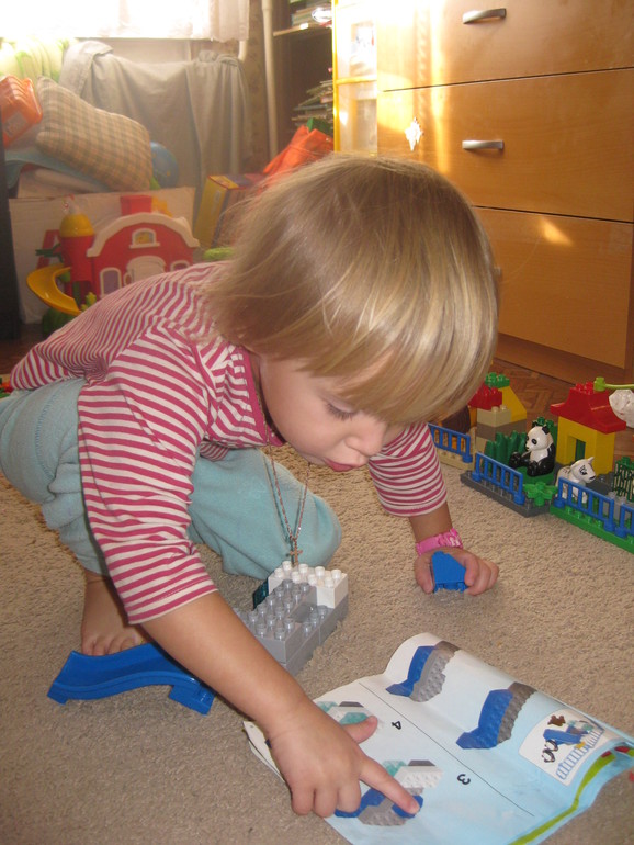 А еще у нас есть набор "Большой зоопарк", в него тоже часто играем. Сейчас Ане интересно собирать по схеме: