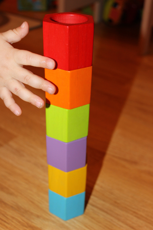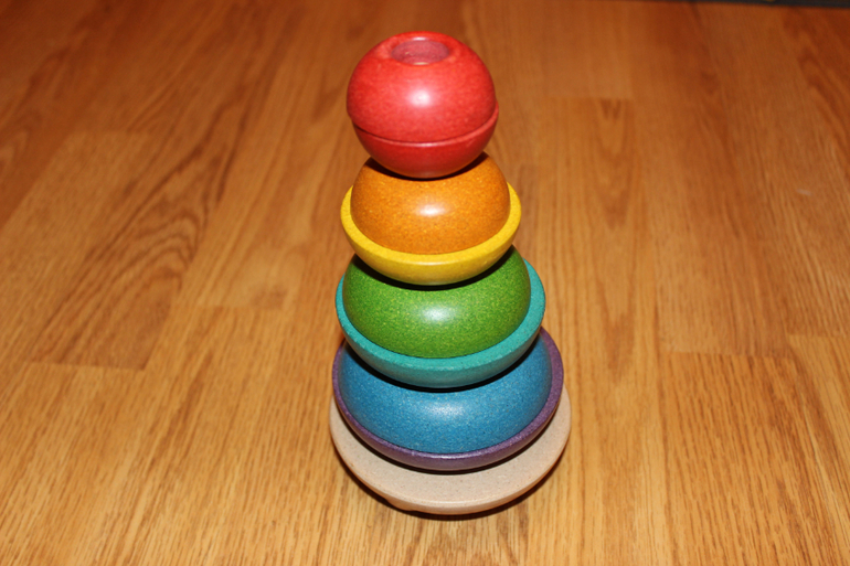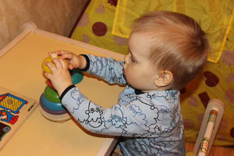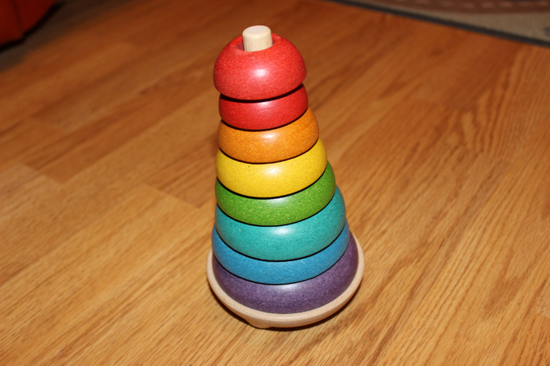 На данный момент одна из наших самых любимых пирамидок. Сын может подолгу заниматься с ней. Мне она нравится тем, что собирать ее можно по-разному... Детали очень увесистые, сама палочка-основа на резинке, подставка очень массивная.
