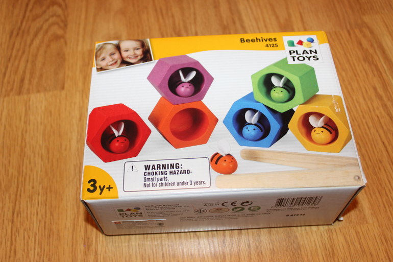 Вообще, игра идет от 3-х лет, но мы нашли применение ей уже сейчас. Цель игры поместить каждую пчелку в свой домик, используя щипцы, при этом пчела не должна упасть. Т.е. игра на ловкость.