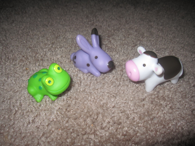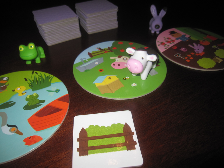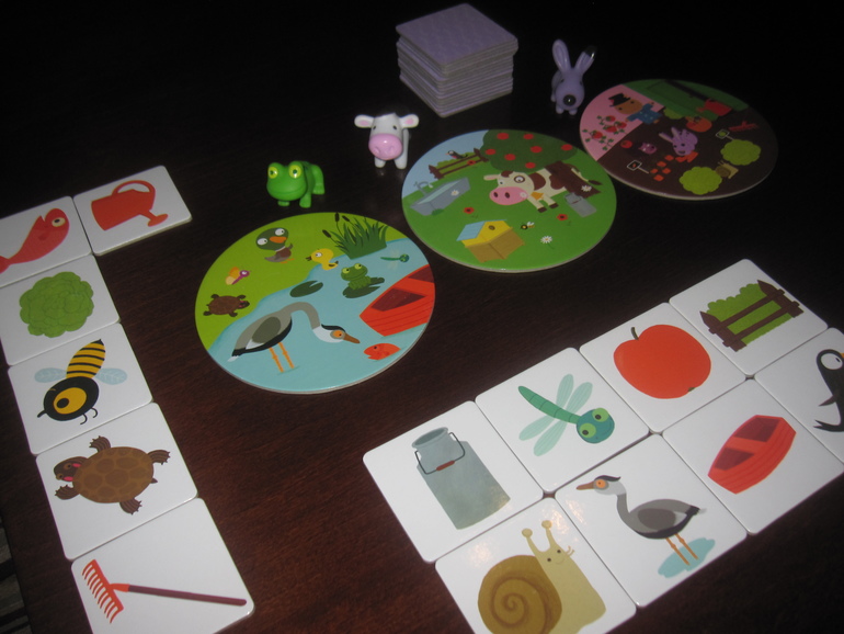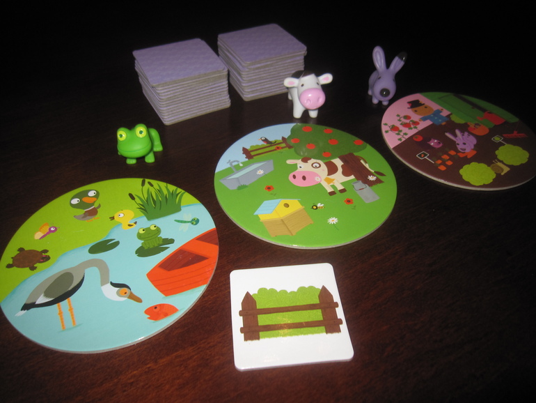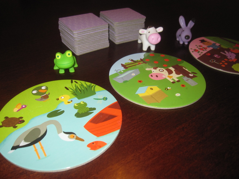 Перед началом игры необходимо поместить 3 круглых поля в центр стола. Рядом с полями фигурки животных - корову возле луга, лягушку возле озера, а кролика возле огорода. Стопку карточек рубашкой вверх тоже помещаем в центре стола.