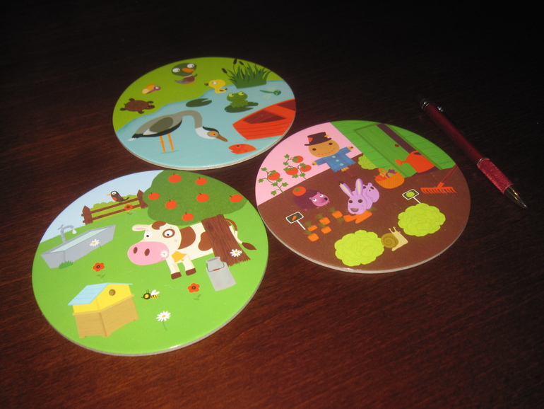 Суть игры проста и вполне будет понятна малышу. Из стопки берем верхнюю карточку, переворачиваем, смотрим рисунок и ищем этот рисунок на одном из круглых полей.