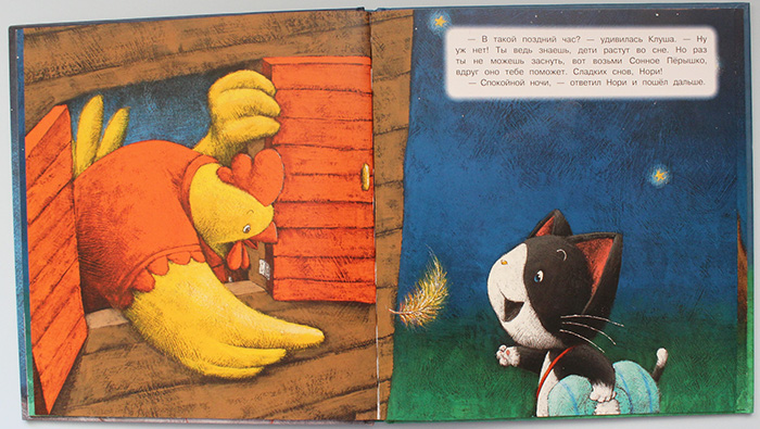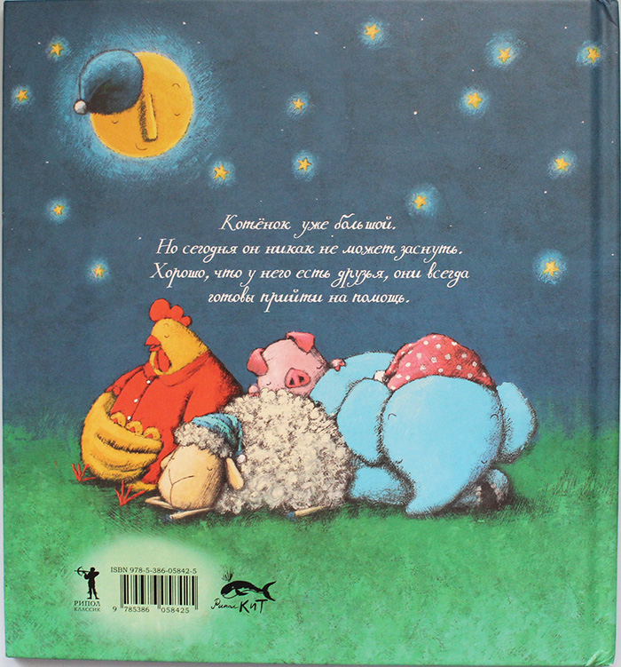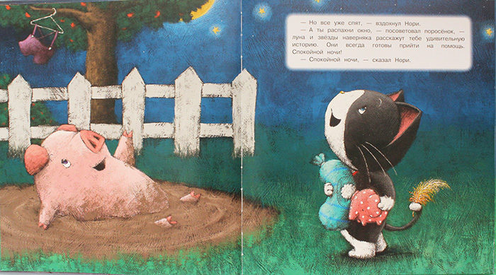 Книга о том, как маленький котенок по имени Нори, никак не мог уснуть и решил посмотреть, что делают его друзья: овечка Бяша, курочка Клуша, слониха Элла, попросенок Чух.