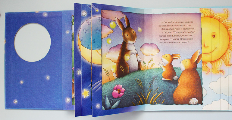 Т.е читая историю, и переворачивая страничку за страничкой с левого бока появляется по-немногу луна, а к концу истории луна заменяет солнце.