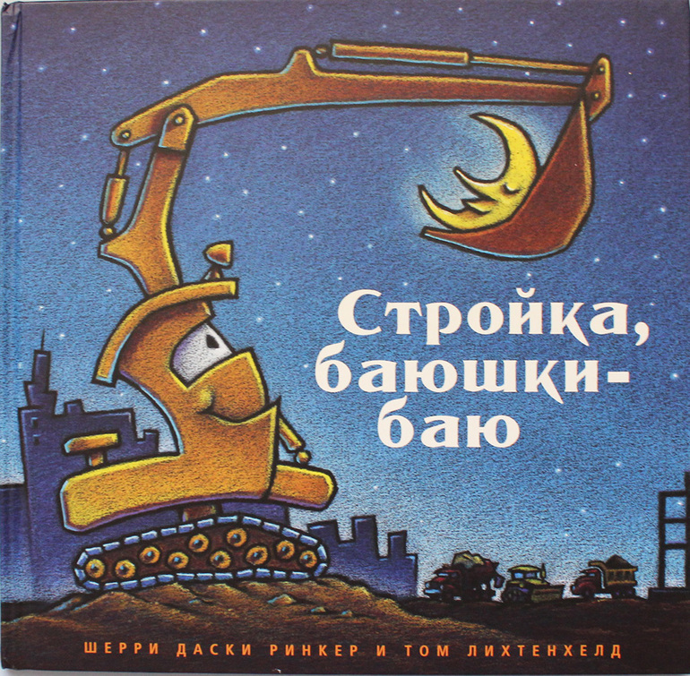 История о том, как стоительные машины завершают свою работу (работая на стройке) и укладываются спать. По моему мнению, задумка просто великолепная, но вот текст страдает (по моему мнению), но моего ребенка нисколько это несмущает. Еще раз повторю очень ее любит! Вот несколько разворотов.