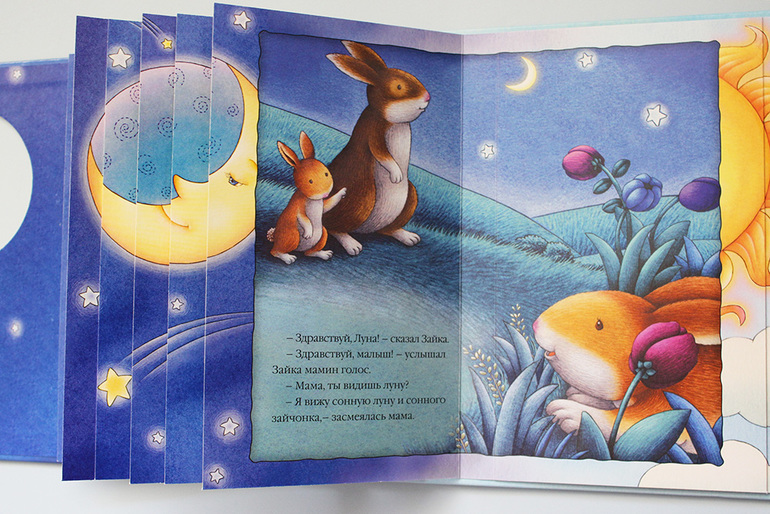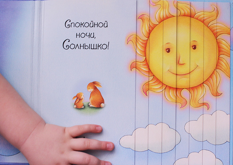 Задумка книги очень интересная, наглядно показывает ребенку, что когда мы просыпаемся светит солнышко (первая страничка книги), но когда приходит время готовится ко сну на небе появляется луна (последняя страничка книги)