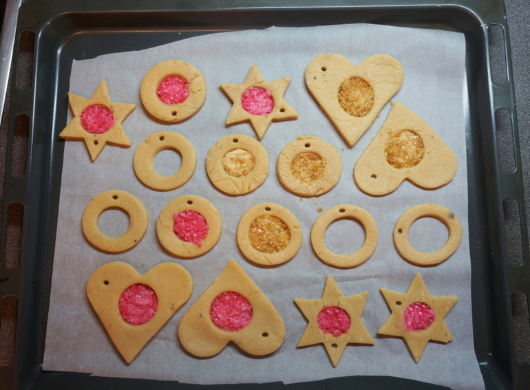 Растопить 200гр меда и 130 гр сахара (лучше коричневого), остудить. Смешать 100 гр сливочного масла (мягкого), 1 яйцо, смесь меда и сахара, 500гр муки, соду гашеную уксусом или пекарный порошок, а такжу любые пряности по вкусу - корица, кадамон, ванильный сахар, гвоздика итд....замесить тесто, поставить в холодильник остужаться. Приготовить колотую крошку из цветных леденцов. Достать тесто, раскатать примерно 0,5см вырезать формами, положить на пергамент и противень, засыпать порошок, поставить в духовку на 170С до золотистого цвета.
