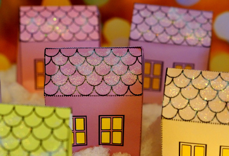 Крыши посыпали блестками, поэтому они у нас переливаются всеми цветами радуги. Выглядит очень красиво и нежно!