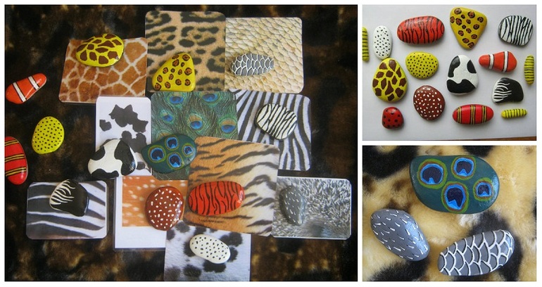 Камни я разрисовывала сама. Их мы тоже можем разложить по карточкам или просто перебирать и играть (например, камень с тигровой шкурой превращается в тигра, который гонится за камнем-зеброй).