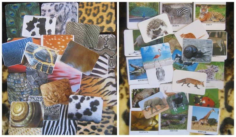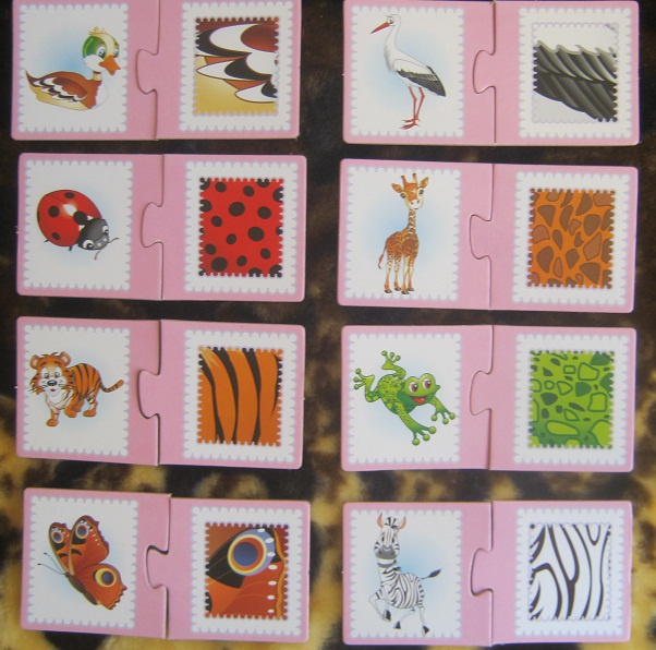 Основная часть из раздач материалов у olik и Jolene. Кое-что я сама нашла. Карточки заламинированы, к каждой есть карточка с изображением животного. Играем просто: подбираем текстуру, обсуждаем. Вот, к примеру, у ягуара не просто пятнышки, а в каждом круге или полукруге из пятнышка есть еще одно пятнышко. Или, что у зебры и окапи похожие полоски.