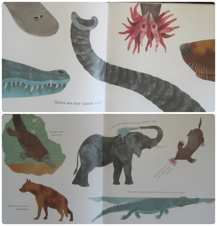 Это своего рода энциклопедия, всего 12 разворотов. Сначала крупно часть животных (носы, хвосты, уши, рты, ноги, глаза), а потом разворот с обладателями этих животных. Книга эта еще и загадка, Дочка, хоть уже и знает всех обладателей этих странных и не очень частей тела, но называет и очень радуется, когда правильно) А в конце книги еще и справочка про всех этих животных.