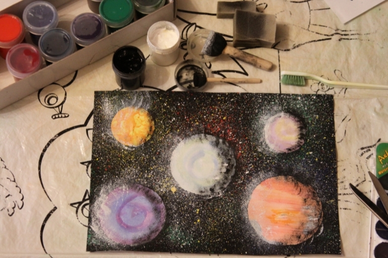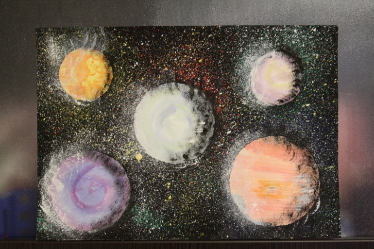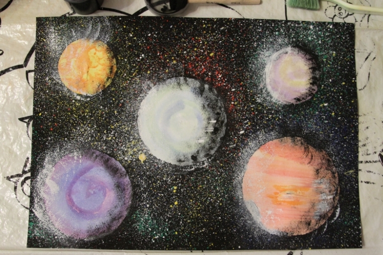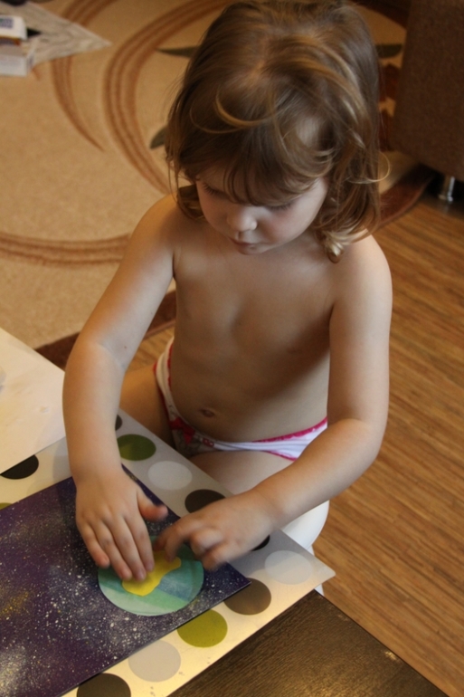 И Анюткина работа. Полюбовавшись на Сонины разбрызгивания, Аня потребовала щетку и краску. Задумывалась аппликация, решили, что добавим "звездного" фона. Планета была уже наклеена, поэтому и её прикрыли картонным шаблоном.