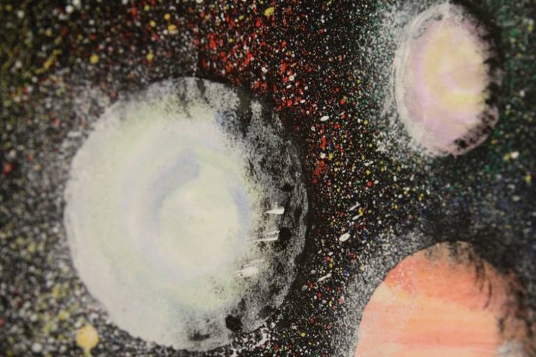 Шаг 2 - убираем кружки в сторону, но не выкидываем - они нам ещё пригодятся. Получившиеся круги раскрашиваем по своему вкусу -у нас акварель по мокрому листу. В левом верхнем углу планету вообще колпачком от фломастера Сонечка раскрасила :) А нижнюю правую - зубной щеткой :)