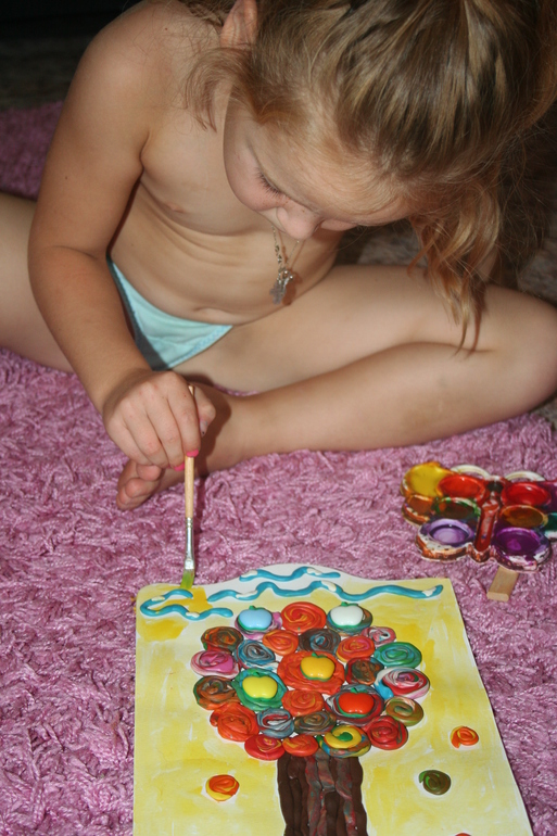 И даже, когда работа, вроде, как была готова остановиться было невозможно, и мы взялись за краски! О, как же это оказывается интересно, создавать не изначальный фон, а придавать цвет уже готовому полотну. Оно сразу ожило!