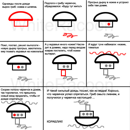 А если так:ливень налил целое море и гриб превратился в кораблик?