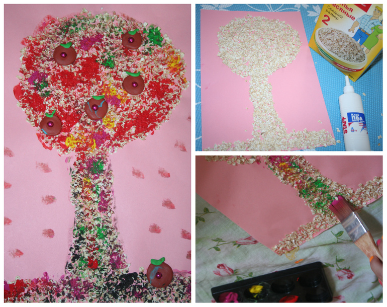 Я очень горжусь этой своей спонтанной придумкой! Дерево получилось очень яркое, текстурное и нарядное. А делается легко: на клей ПВА засыпаются овсяные хлопья, а как только они просохнут (лучше на следующий день) можно красить гуашью, но желательно, чтобы кисточка не была мокрой. Деревце можно украсить яблочками или грушами из пластилина.