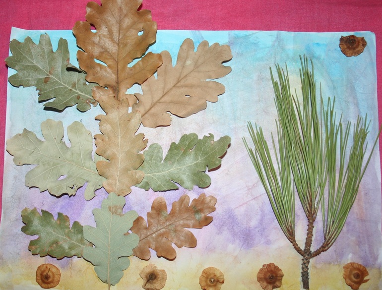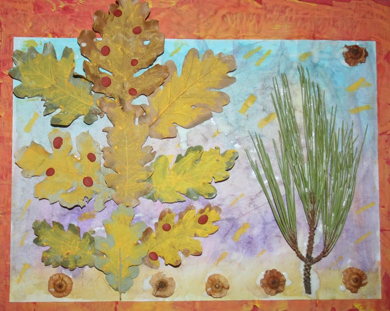 С листочками можно экспериментировать очень долго. Можно нарисовать ствол и сделать пышную крону, можно создать густой лес со множеством деревьев-листиков, а можно, как сделала Камилка, собрать из множества листочков одно большое пышное дерево. Клеить листики и другое природное богатство удобно на двухсторонний скотч, но потом можно еще и клеем ПВА пройтись, чтобы, уж, наверняка.