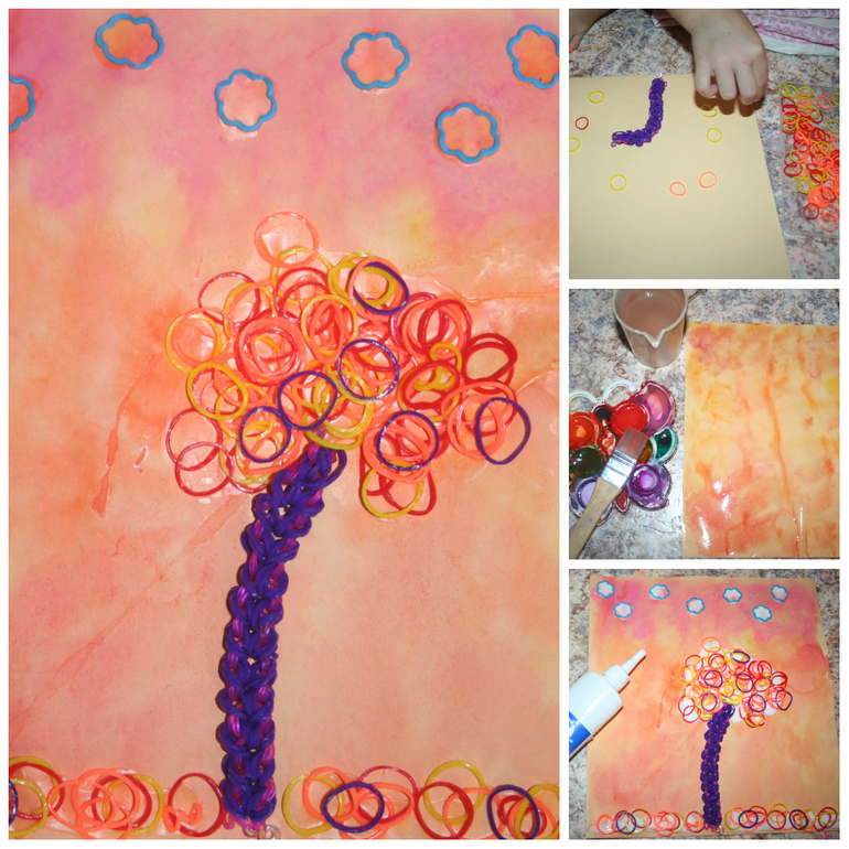 Цветные резиночки, которые сейчас так популярны, и любовь к которым и у нас проснулась не так давно - шикарный материал для творчества. У нас с Камиком уже была попытка использовать их для нестандартного творчества, и вот мы решили ее повторить. Фон создавали в технике мокрой акварели, а резиночки крепили на клей ПВА. На наш взгляд, получилось очень нарядно и необычно, и что не мало важно - надежно, главное дать клею как следует просохнуть!