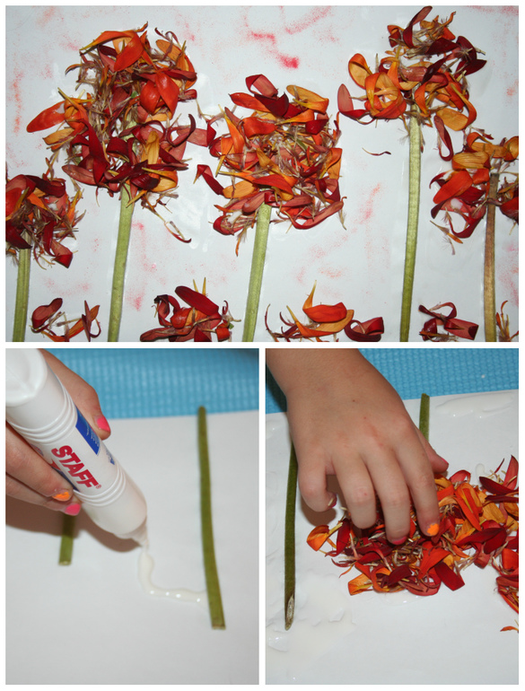 Мы давно практикуем творчество из увядших лепестков, вот тут, например, про цветочное ателье писала. Поэтому как только прекрасные герберы стали менее прекрасными, мы их тут же приспособили в качестве основы для осеннего леса. Работы снова на пять минут, главное клея не жалеть, зато красота получается невероятная, так и просится в рамочку :-)