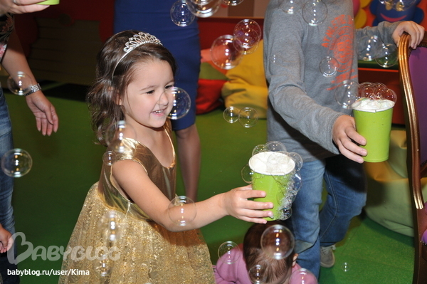 Вначале мы встречали гостей, получали подарки, танцевали и играли, больше всего детям понравилось ловить мыльные пузыри, кто больше!