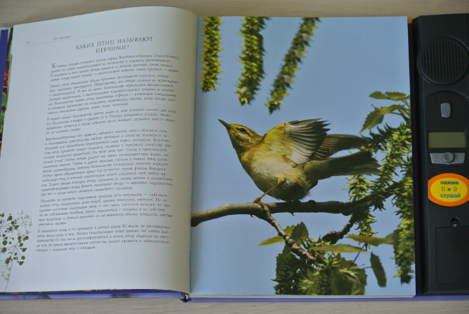 Книга, которую давно хотелось видеть на нашей полке, но все откладывала из-за жаба душила и так большого списка книг первой необходимости:))). И чем ближе приближалась весна, а за ней и первые ощущения лета, тем чаще не покидали меня мысли: "Скоро уже уедем на лето в деревню. Можно посравнивать там голоса птиц...". Да и вообще подобное издание всегда пригодится в подготовке уроков по Окружающему миру:). Звуковой модуль, превосходные фотографии и понятное описание для обычного обывателя - все радует. Далее скопирую отзыв из все того же Читательского дневника: