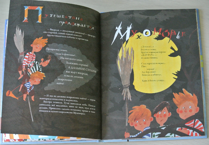 Подкупили к покупке оригинальное оформление и 3 героя-мальчишки, которые отправились в эти самые дальние страны. Скорей всего моим пиратикам понравилось мое эмоциональное чтение. Разворот с картой-перевертышем сон как рукой отбило (а было уже за полночь), хохотали до слез. Просили перечитывать (потом и сами крутили-читали) раз 10, если не больше. Так им эта идея понравилась. Плюс хихикали над продавцом зонтиков в дырочку. И очень понравились колоритные усы у другого мужчинки... На след.день после прочтения младший пират заявил, что прочтет эту книгу сам. После первой страницы отложил - начинающему читателю конечно же противопоказано такое чтиво:))) И шрифт гуляет, меняется, и строки бегают, заворачиваются. И фон каким только не бывает...