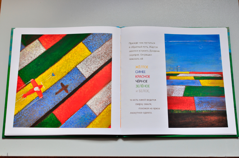 Текст очень поэтичный, вот так красиво заканчивается сказка: "Какое у нас получилось замечательное путешествие! А теперь я могу отдохнуть, пожевать зеленой травки. Но если вновь стану мечтать, обещай мне, Мартэн, что ты еще вернешься, ведь все эти краски ты носишь на своих крыльях." Ах уж эти французы! :)