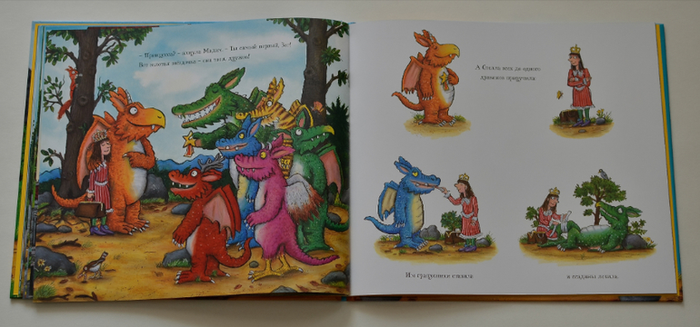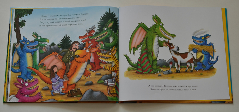 Когда в продаже появилась книга "Зог", я не раздумывала ни секунды, заказала, даже не посмотрев толком фотографии разворотов. Мне было достаточно того, что это Дональдсон+Шеффлер+Бородицкая, и того, что в главной роли рыжий дракон. Интуиция не подвела, книга великолепна: яркая, веселая, добрая, ребенок в полном восторге!