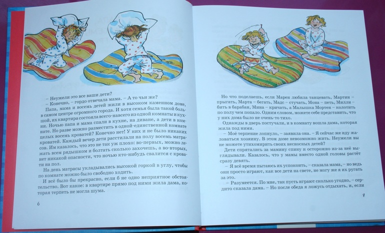 Это наша новая самая любимая семейная книжка, причем прониклись мы к ней теплотой совершенно недавно. В нашей библиотека она уже больше полугода, но дальше нескольких глав мы раньше никак не могли продвинуться, и вот, все изменилось. История проглочена и хочется еще! К счастью есть целых два продолжения, и мы с нетерпением ждем посылку, чтобы продолжить чтение :-) Очень нам понравилась эта книга своими простотой, добротой, милым юмором и необычными бытовыми ситуациями. В нашем материальном мире так не хватает умения радоваться пустякам и гордиться тем, что имеешь. Мне кажется, "Папа, мама и 8 детей" как раз из такой редкой детской литературы, которая учит смотреть на жизнь проще и искать счастье в самых банальных вещах!