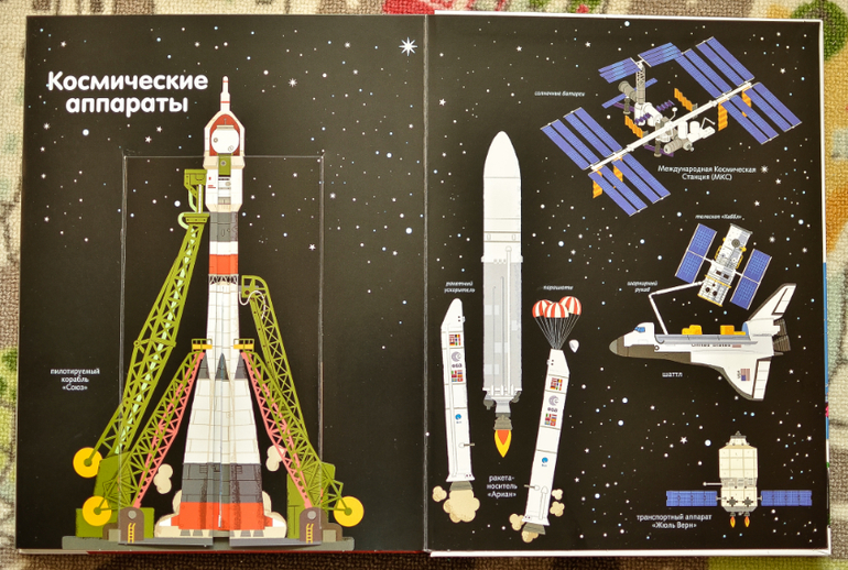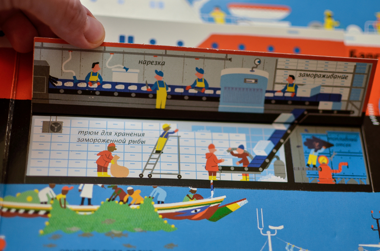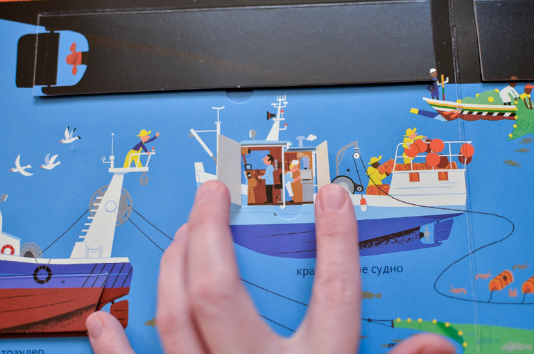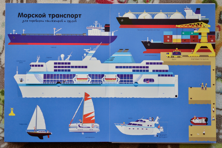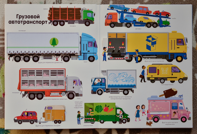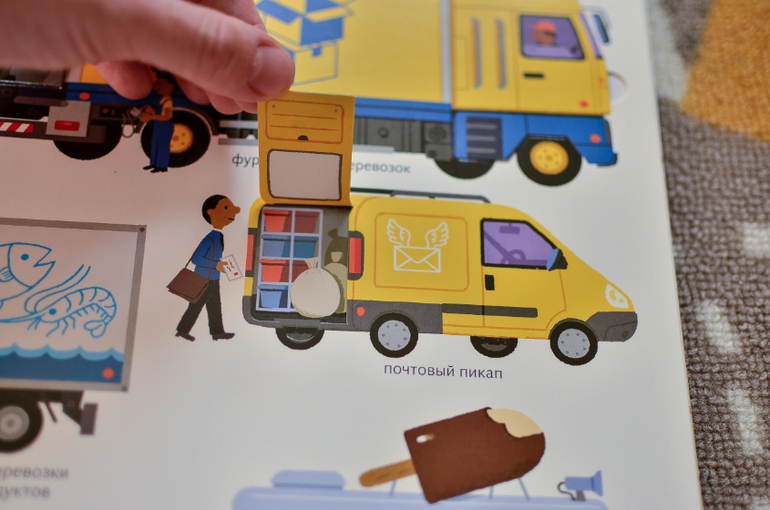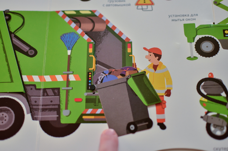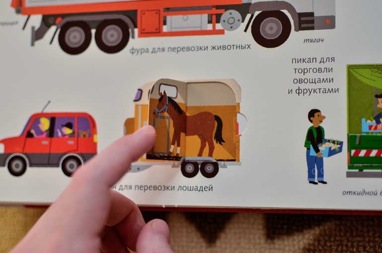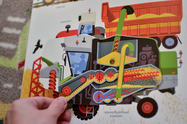 дошкольникамБольшая и очень интересная книга про технику. Здесь все: от автомобиля до космического корабля. Текста практически нет, только подписи к картинкам, но все эти бесчисленные окошечки, крутилочки, ползуночки дают столько информации! Я, например, и не знала раньше, что происходит внутри зерноуборочного комбайна, как спрессовывается мусор в машине-мусоровозе или как перерабатывают рыбу на плавучем рыбзаводе.