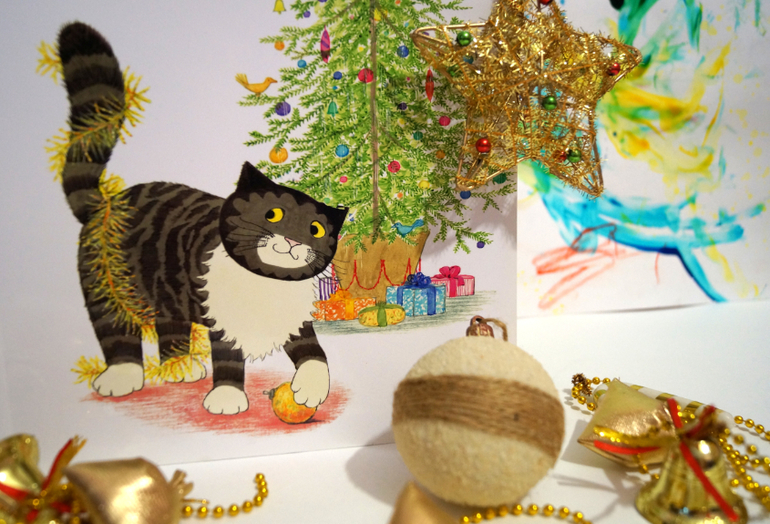 В свете последних предпраздничных приготовлений с установкой ёлки, вырезанием гирлянд и хаотичными метаниями нашей коши по всей квартире - книга до невозможности актуальная. А ещё там есть месяц, снег, купание и обнимашки. Просто чудо, а не книга. К тому же, мы нашли ей практическое применение. Например, я рисую Мяули, а Алиска - мишуру на её хвосте. Обе - в меру своих художественных способностей, ага.