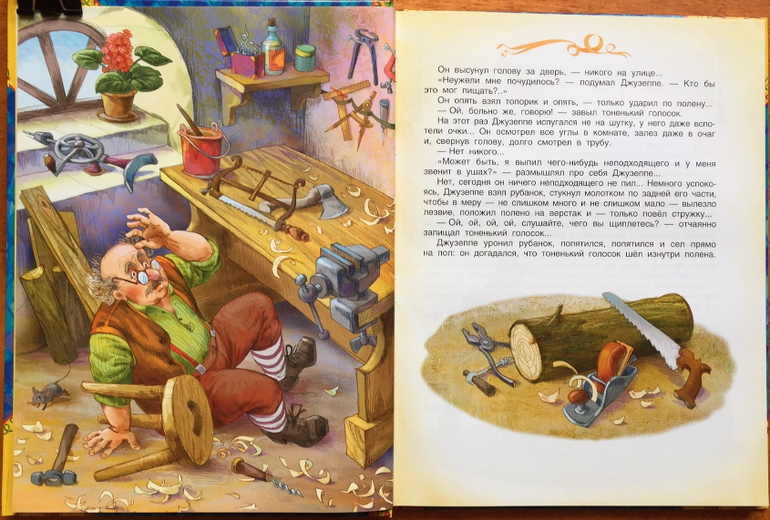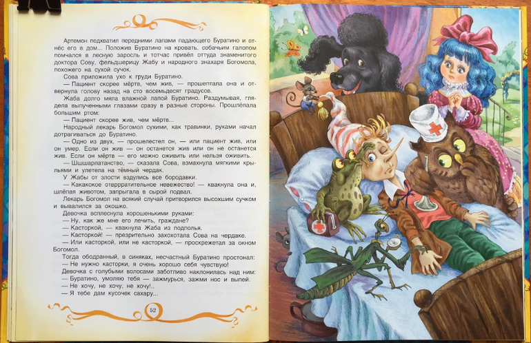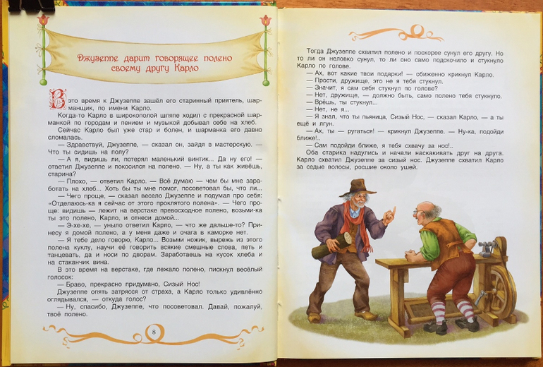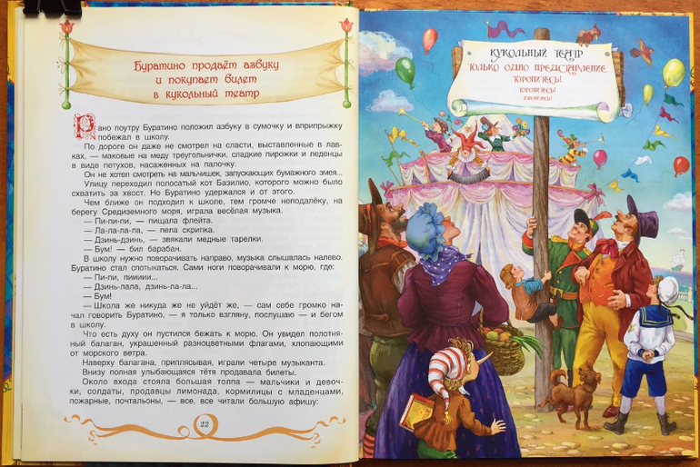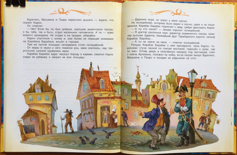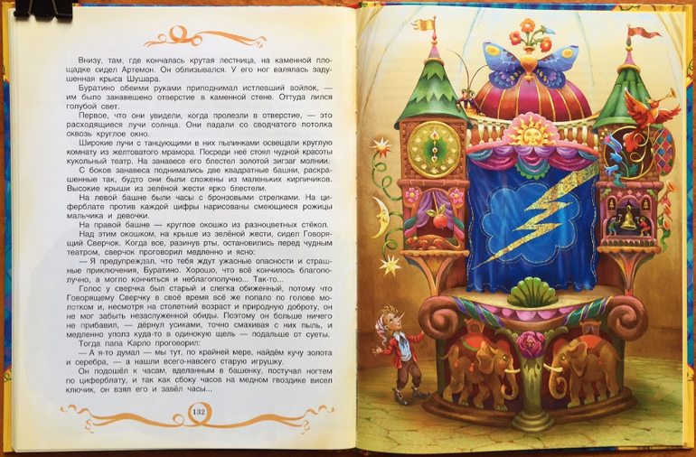 Тоже издательство Росмэн, в бархатной обложке, красивые рисунки. Только стоит в четыре с половиной (!) раза дороже. В какой-то момент я даже положила в корзину оба варианта, но потом жаба задавила, я стала внимательно изучать ту, что дороже, и пришла к выводу, что внутренности у них одинаковые! Рисунки одного автора, и там, и там одинаковое количество страниц. Только бархатная чуть большего формата. Поэтому я с облегчением выкинула ее из корзины, но зато, чтобы "добить" до тысячи для бесплатной доставки взяла второй экземпляр выбранного "Буратино"