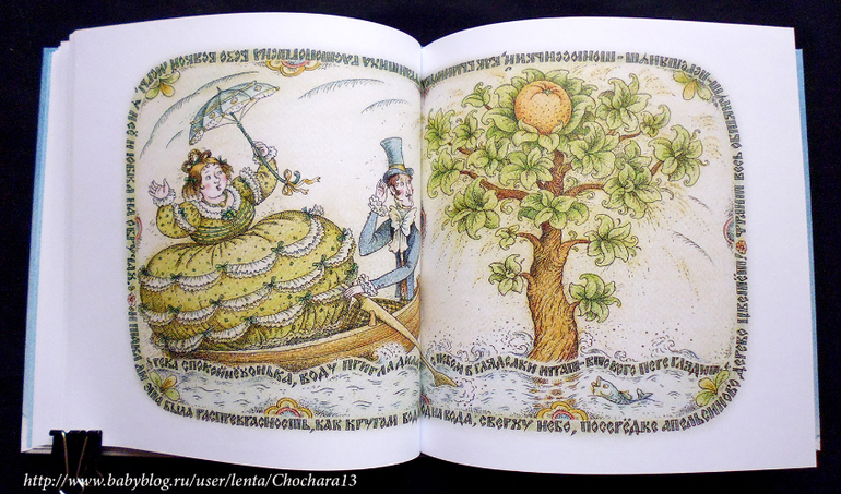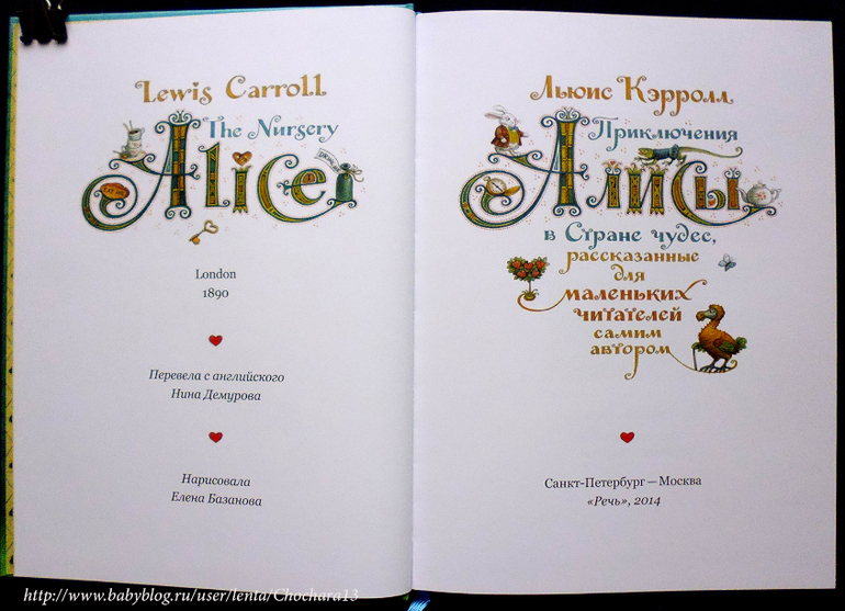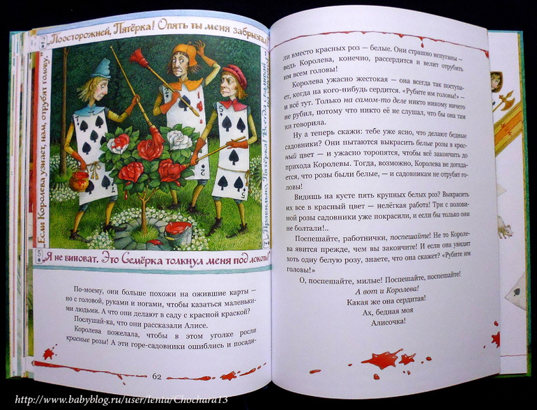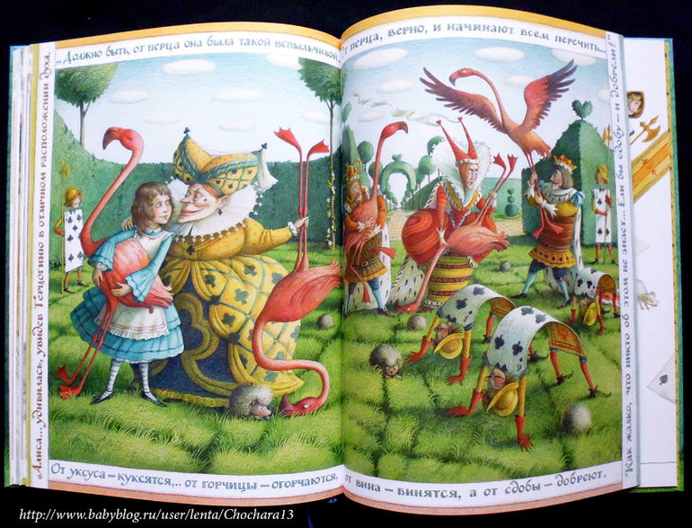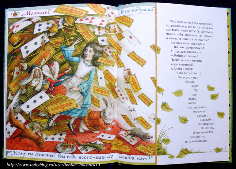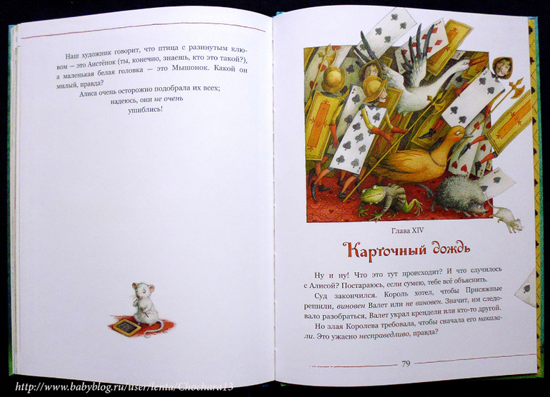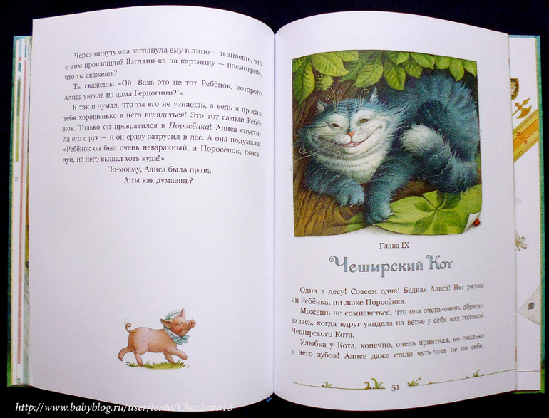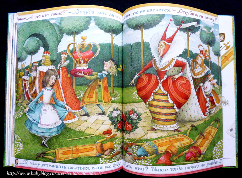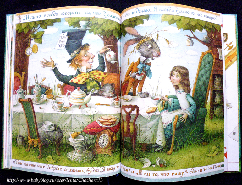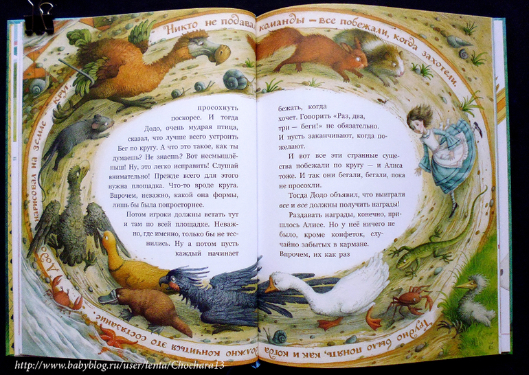 Большой формат, мелованные страницы, крупный, легко читаемый текст, впрочем, как всегда у "Речи" - претензий к тексту нет. Рисунков очень много. Поскольку текст сокращен, отдельные предложения, чаще - мысли самой Алисы или уточняющие факты, даны в виде обрамляющего текста на самих иллюстрациях. Поэтому соответствие текста рисункам всегда идёт страница в страницу. В отличие от Ингпена, которого я лично нежно люблю, Алиса Базановой мне нравится даже больше.![]()